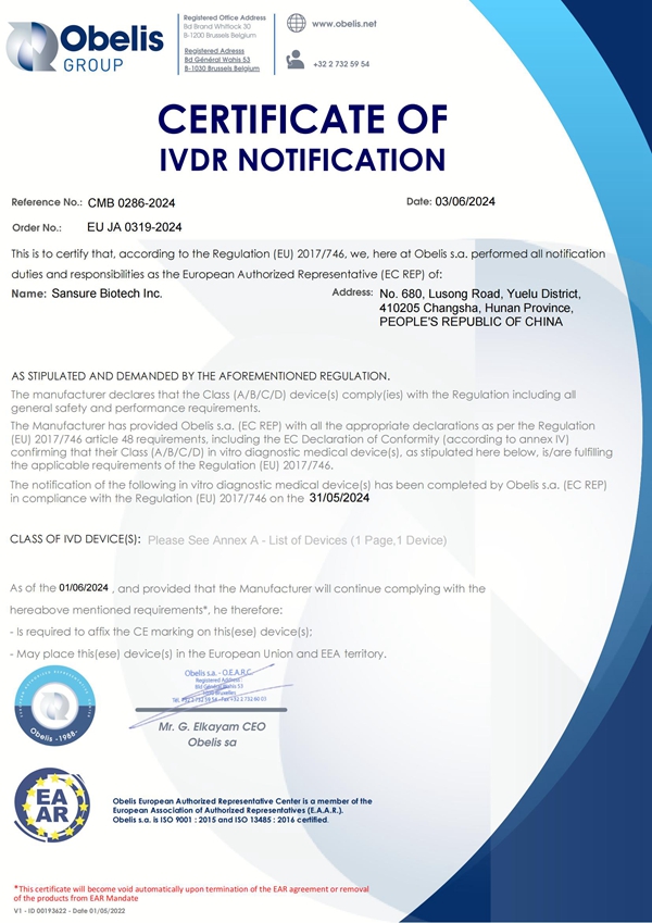 近日,尊时凯龙生物自主研发的结核分枝杆菌核酸检测试剂盒(PCR-荧光探针法)获欧盟CE IVDR认证,这是公司呼吸道产品获得的首个Class C级别的准入证书,为公司结核产品的全球布局提供了有力支持,也为全球在2030年前消灭结核的目标贡献了“尊时凯龙力量”。